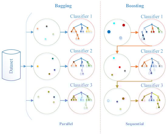 Additionally, it serves as a highly efficient approach for mitigating overfitting in decision trees. Random forest is a type of bagging technique. In these three variants, the attributes used for splitting at each node are chosen randomly. Figure 3 illustrates the operational mechanism of bagging and boosting on trees. Parallel bagging executes each tree concurrently, whereas boosting is carried out sequentially [68].