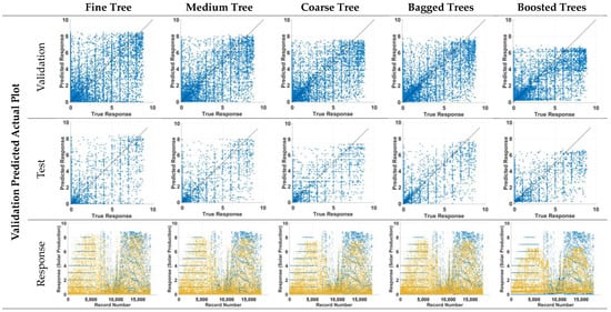 The hyperparameters employed in the fine tree, medium tree, coarse tree, bagged tree, and boosted tree models were provided, along with corresponding parameters and details regarding training time and memory usage. Figure 5 displays the current prediction data and the corresponding outcomes for the verification estimate, based on the information provided.