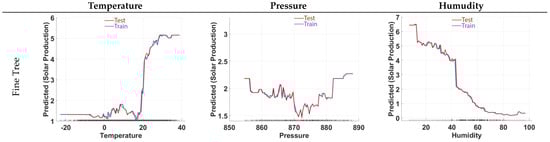 The findings show that solar energy forecasting models have the potential to significantly increase the accuracy of production estimates. The effects of temperature, pressure, and humidity on energy production are presented in Figure 6. It shows how the temperature, pressure, and humidity data produced results during the training and testing period. The figures showing a comparative result provide suggestive indicators. The models developed in our study could apply to effective management and strategic planning of renewable energy resources. Future research should investigate the validation of these models under various environmental conditions and geographical regions, thereby expanding their applicability and improving the prediction accuracy under various climatic conditions. The results reveal that temperature, pressure, and humidity have significant impacts on PV energy production, requiring models capable of capturing their non-linear interactions. Policies supporting localized weather monitoring and adaptive forecasting systems can enhance the accuracy of renewable energy management and planning.