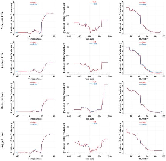 This study aimed to evaluate the effectiveness of various tree-based EL models in predicting photovoltaic (PV) energy production by analyzing the effects of environmental factors such as temperature, pressure, and humidity. The results revealed that bagged trees and boosted trees models exhibit favorable prediction results on complex datasets, which highlight the advantages of using advanced tree-based algorithms for similar use cases. The bagged trees model was shown to be the most effective model, producing an RMSE of 1.7152 and an R2 value of 0.5650. These metrics showed that the model effectively reduced dataset noise and minimized overfitting, thus increasing the reliability of the predictions. Regarding the learning results, bagged tree and boosted tree models achieved the best performances among tree-based models with a minimum of eight leaves. Bagged tree trained each decision tree on many different subsamples taken from the dataset and combined the results of all the trees to produce a new tree. This tree was tried to produce predictions as the final tree. At this point, it has been seen that the bagged tree produces successful results and exhibits superior performance than other tree structures. The working principle has shown that it produces better results than other tree structures. The fine tree model showed the weakest performance with an RMSE value of 1.9696 and an R2 value of 0.4264. This highlights the limitations of simpler decision tree models when faced with complex datasets, suggesting that they may not be equipped to capture the complex relationships found in PV energy production. Our findings are consistent with previous literature suggesting that EL approaches such as bagged and boosted trees tend to outperform individual decision trees. Figure 5 visually presents the validation, testing, and response results of the fine tree, medium tree, coarse tree, bagged tree, and boosted tree. As shown in Table 4, extracted through a systematic review of the literature, the superiority of these models reinforces the idea that more sophisticated algorithms are required to accurately predict energy production under changing environmental conditions. However, it is important to acknowledge that training these EL models requires significant computational resources and time. When we look at the MAE validation and MAE test results, the fact that the difference between these two values is very small indicates that there is no overfitting and that the data and models work correctly. Researchers working on this topic should consider the size and complexity of the datasets when selecting appropriate models for real-world applications. Despite significant advances in tree-based, random tree, and random forest algorithms, the current body of research focuses primarily on survey studies rather than practical applications in the energy sector. In addition, although tree-based algorithms are widely used in healthcare, especially in disease identification through image processing, their application in processing real-time data for energy prediction remains limited. This study addresses this gap by providing a comparative analysis of different methods, thus providing valuable insights into the existing literature.