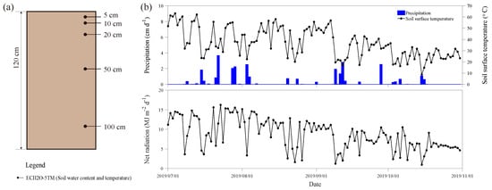 (a) The 1.2 m soil column profile. Sensors are installed at depths of 5 cm, 10 cm, 20 cm, 50 cm, and 100 cm to measure soil water content and temperature. (b) Meteorological data during the study period, including daily precipitation, surface temperature, and net radiation.