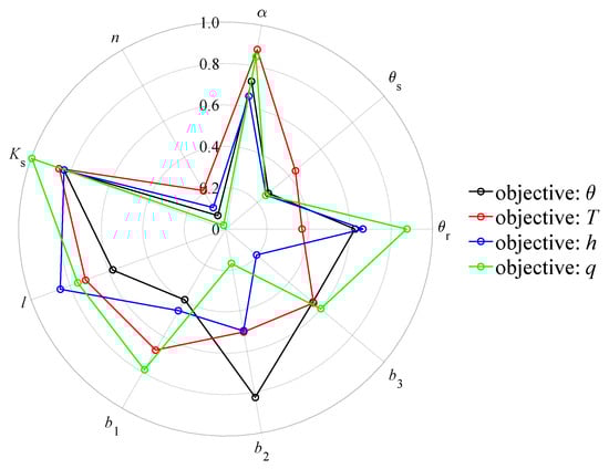 In this section, we first show the results of single-objective optimizations, where the objective variables are any one of , T, h, q. The optimal parameters obtained under these four single-objective scenarios, which show differences in estimated hydraulic and thermal parameters, are presented in Table 2. In particular, the disparity is obvious when using T as the objective variable. To visually compare the simulation results, we normalize Table 2 according to the parameter ranges and plot a radar chart (Figure 2). The figure shows that when T (red circles) is used as the objective variable, most of the optimal parameters, particularly , , and n, differ from those obtained for other objectives. Additionally, under different single-objective scenarios, parameters , , and exhibit significant variability. This reflects the differing behaviors of water and heat transport dynamics in parameter inversion. Based on this, we speculate that T has low sensitivity to hydraulic parameters.