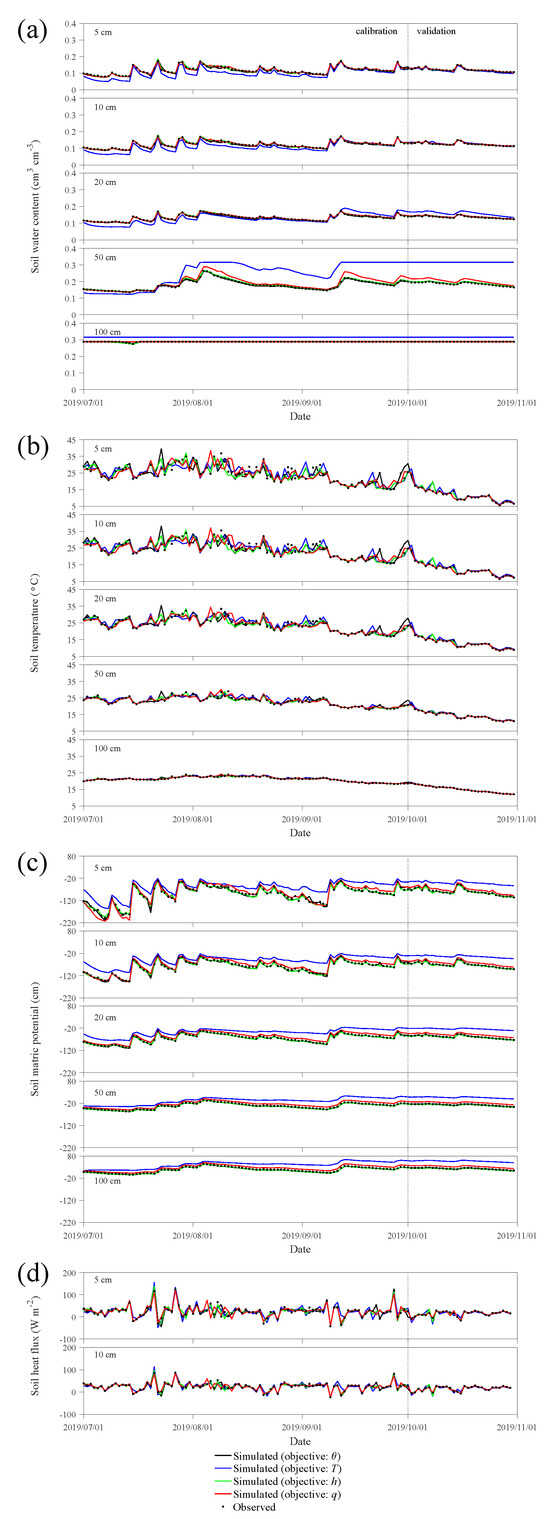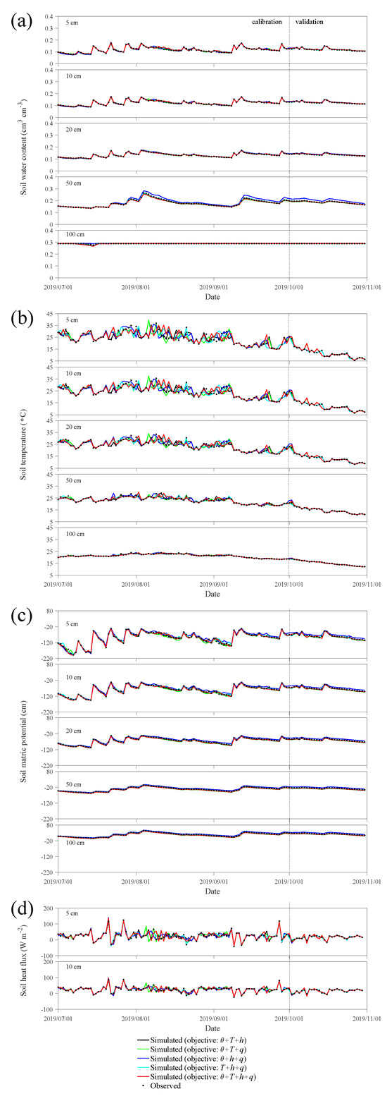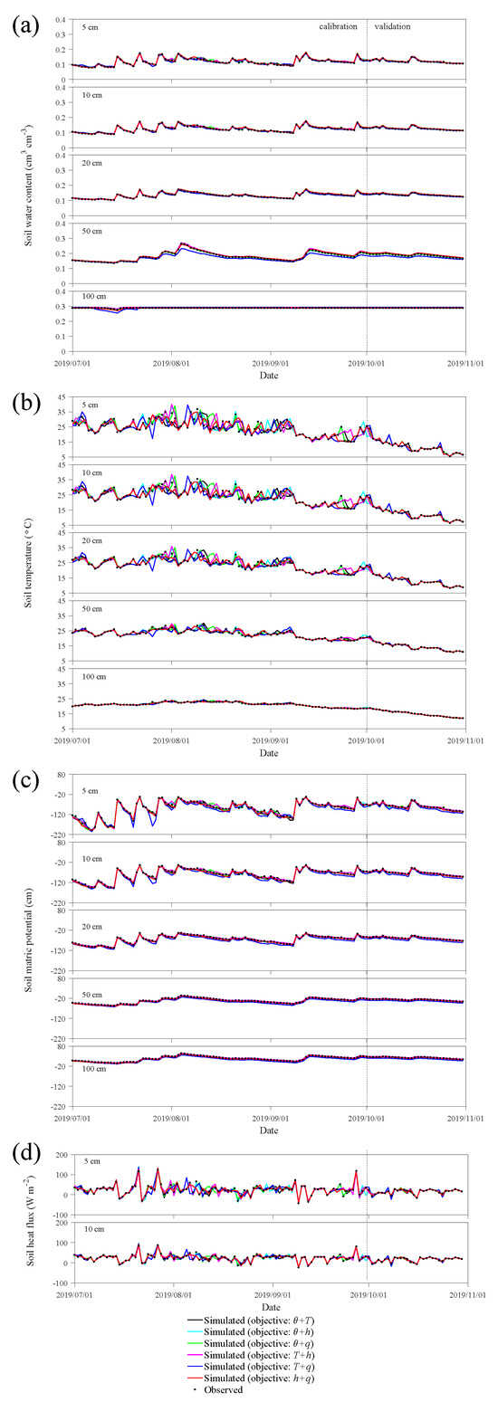 Based on these optimal hydraulic and thermal parameters, we simulate the coupled water vapor heat transport during 1 July 2019–31 October 2019, and compare the model predicted values of , T, h, q with those of “true” observations. The period from 1 July–30 September is used as the calibration period, and from 1 October–31 October as the validation period. Figure 3 shows the variations in (Figure 3a), T (Figure 3b), h (Figure 3c), and q (Figure 3d) at depths of 5 cm, 10 cm, 20 cm, 50 cm, and 100 cm under different single-objective functions, where the black circles represent the observed values, and the black, blue, green, and red lines represent the simulated values when the objective variable is , T, h, and q, respectively. In general, the simulation performs better when using or h as the objective variable, particularly for the simulation of and h. However, the simulation results are poorer when T is used as the objective variable, except for the simulation of T itself, which performs well. This also corresponds to Figure 2, where the optimal parameters obtained under this objective function are different from compared to those obtained with other objectives. Additionally, when q is used as the objective variable, the simulation of water movement performs better than when T is used, but the accuracy is not as high as when or h is used as the objective variable. Therefore, we infer that and h are important factors in water movement, and thus using or h as the objective variable can better simulate water movement. In contrast, T has limited effectiveness in simulating hydraulic parameters, and thus cannot simulate water movement well. q, which combines both thermal and hydraulic processes, can better simulate water movement when used as the objective variable.