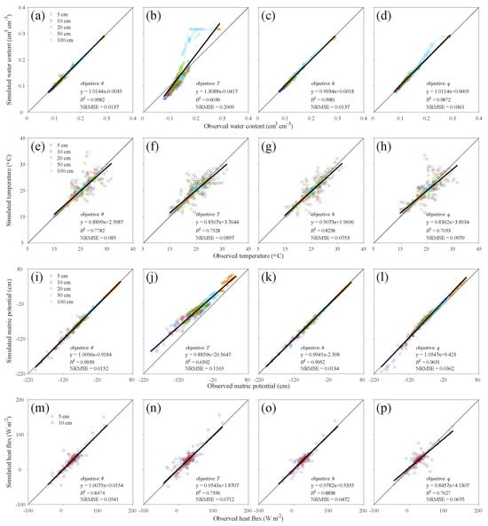 The 1:1 line plots of simulated and observed values for different variables when , T, h, and q are used as the single-objective variable. (a–d) show the 1:1 plots for under different functions, (e–h) for T, (i–l) for h, and (m–p) for q. Dark blue, red, green, light blue, and orange circles represent observation depths of 5 cm, 10 cm, 20 cm, 50 cm, and 100 cm, respectively.