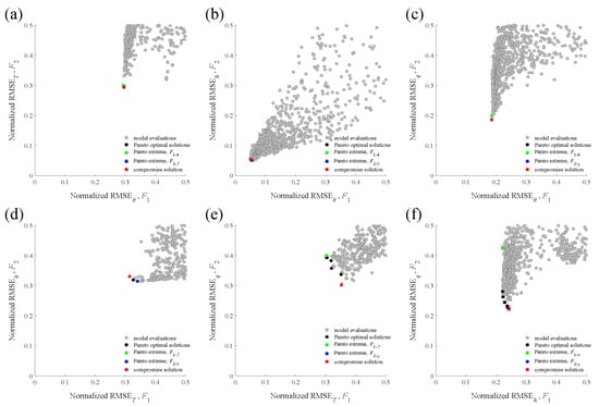 The Pareto optimal solutions in the dual-dimensional Pareto trade-off space. The gray, black, green, blue, and red circles represent model solutions, Pareto optimal solutions, extreme solutions of objective functions and , and compromise solution, respectively. The objective variables of the graphs are: (a) + T, (b) + h, (c) + q, (d) T + h, (e) T + q, and (f) h + q.