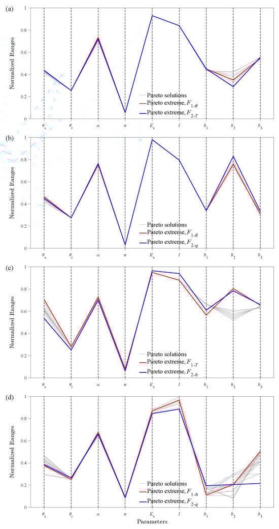 Normalized range of optimal parameters values for the nine soil parameters. Grey, red, and blue line represent the Pareto optimal solutions, the extreme value solution of the objective function , and the extreme value solution of the objective function , respectively. The objective variables of the graphs are: (a) + T, (b) + q, (c) T + h, and (d) h + q.