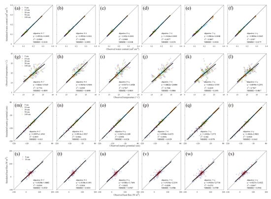 The 1:1 line plots of (a–f), T (g–l), h (m–r), and h (s–x) for dual-objective functions optimization ( + T, + h, + q, T + h, T + q, h + q). The dark blue, red, green, light blue, and orange circles represent observation depths of 5 cm, 10 cm, 20 cm, 50 cm, and 100 cm, respectively.