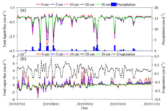 The changes in total liquid water flux (a) and total vapor water flux (b), with + T as the objective variables. The red, blue, pink, black, and green lines represent observation depths of 0 cm, 5 cm, 10 cm, 20 cm, and 30 cm, respectively. In (a), the blue bars represent daily precipitation, while in (b), the black dashed line represents daily evaporation.