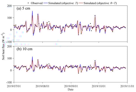 Comparison of the variation in soil heat flux, with a and b representing the heat flux at depths of 5 cm and 10 cm, respectively. The black circles indicate observed values, while the blue and red lines correspond to the objective variables for T, + T, respectively.