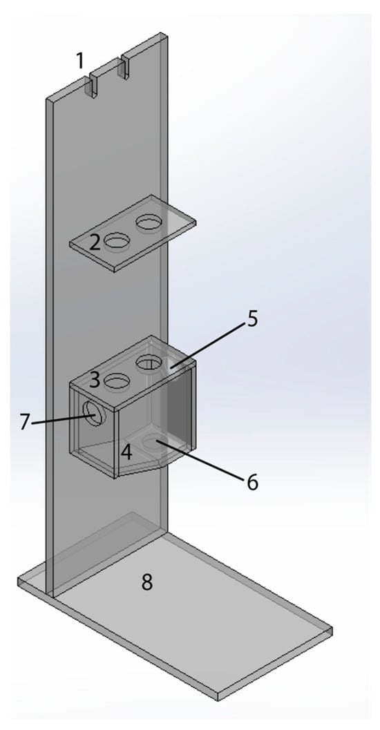 Measurement cell for external electrode sensors made by acrylic. 1. Cable management of electrodes. 2. Perforated holder for electrodes. 3. Measurement cell apertures for electrode mounting. 4. Primary measurement cell body for receiving liquid samples from the bioreactor. 5. Bioreactor sample inlet. 6. Content outlet. 7. Maintenance solution inlet for electrode preservation. 8. Base.