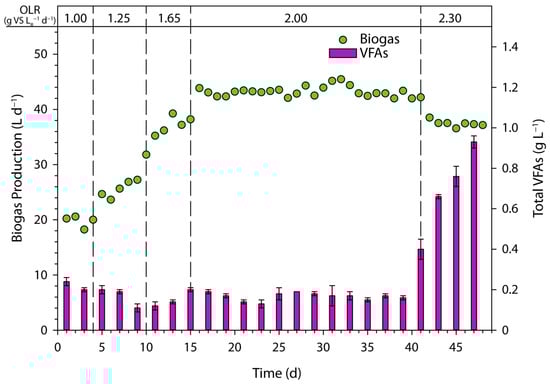 However, on day 41, the biogas production decreased due to the increased addition of oleic acid to the bioreactor, caused by the malfunction of the peristaltic pump mentioned earlier. Afterwards, it stabilized for a 7-day period at 38.02 ± 1.76 L d−1. Subsequently, a sudden reduction in biogas production was observed. This decrease may be attributed to several factors, including the introduction of oleic acid, which can inhibit microbial activity [32,33]. Additionally, the absence of lignocellulosic materials in the substrate, which could have aided in microbial immobilization [34], combined with a low HRT for this type of substrate, probably contributed to the washout of microorganisms essential for biogas production.