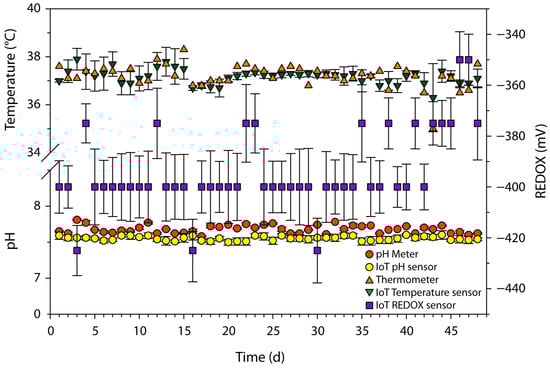 Overall, the proposed system appeared to perform well in monitoring the pH values of the reactor, as the average deviation between the pH meter and the IoT sensor readings was only 1.67% throughout the experiment. Thus, the presence of the IoT sensor provides a representative indication of the reactor’s pH condition. However, as previously indicated, monitoring the pH alone is not sufficient for a well-buffered system, given the low sensitivity in the pH response in these reactors [10].