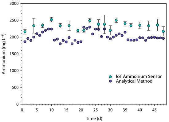 Daily ammonium concentration of the IoT bioreactor measured by ISE ammonium sensor and by the analytical method of Kjeldahl distillation.
