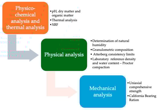 For physical analysis, three mixtures were analyzed. The first represents the examination of pure sediment without the addition of 0% binder and then with the addition of 3 and 5% phosphogypsum. Their application is reflected in their use as a road embankment and whether they fulfill the properties for the construction of such a layer. The idolized test is shown in the following block diagram (Figure 1).