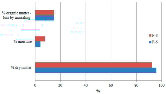 For sample F-5, it is 15.25%, and for F-3, it is 15.14%, which suggests that phosphogypsum has a minimal effect on organic matter. From these results, it can be concluded that increasing the content of phosphogypsum in the sediment reduces moisture and increases dry matter, while the content of organic matter remains stable. Figure 2 shows the percentage content of dry and organic matter as well as the moisture content in mixtures F3 and F5.
