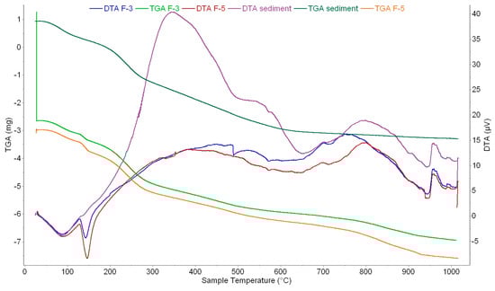 The peak of DTA curves around 570 °C (third range of 400–700 °C, Figure 3) could be attributed to the dehydroxylation of clay minerals, especially kaolin [41]. In some cases, this can be connected to the conversion of one form quartz to another 43]. The sediment sample had the highest mass loss values compared to the other two samples (Table 5).
