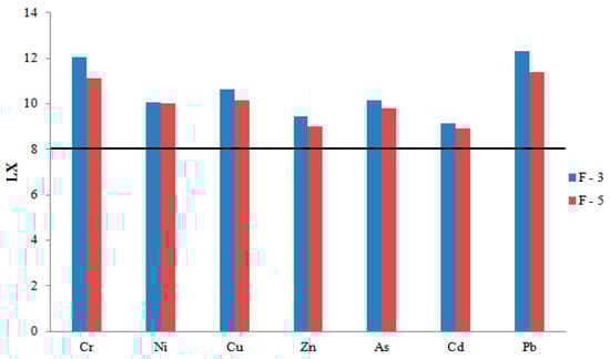 Average leaching indices (LX) in S/S mixtures F-3 and F-5.