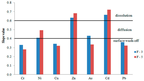 For zinc and cadmium in both mixtures, slope values exceeding 0.6 indicate that dissolution is the primary leaching mechanism, suggesting these metals have higher solubility within the S/S matrix. This could result in increased mobility and potential for environmental release. While these findings highlight some limitations of the current S/S treatment for zinc and cadmium, the gradual release of these metals may still be manageable with proper monitoring to ensure it remains within regulatory limits.