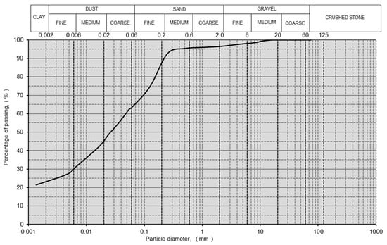 Figure 7 illustrates the granulometric composition of the aggregate, revealing a complex interplay of particle sizes within the mixture. The analysis indicates that over 20% of the particles are clay, while approximately 45% consist of fine dust-like materials. The sandy component constitutes around 30%, with gravel particles measuring less than 3.5%, as determined by a 4 mm sieve. This particle size distribution suggests that the material is predominantly plastic and clayey–dusty in nature. The higher proportion of finer particles, particularly in the 0.063–0.02 mm and 0.02–0.006 mm ranges, enhances the mixture’s cohesiveness and may significantly improve its mechanical properties, such as compressive strength [50,51].