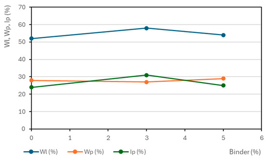 Atterberg’s consistency limits were determined for three characteristic mixtures: clean sediment, sediment samples with 3% phosphogypsum added, and those with 5% phosphogypsum added. The test results include the Liquid Limit (Wl), Plastic Limit (Wp), and Plastic Index (Ip) of the material and binder. Figure 8 displays the tested samples, with the x-axis representing the proportion of the binder and the y-axis showing the percentage values of the individual tests (Wl, Wp, and Ip). As the percentage of phosphogypsum increases, both the Liquid Limit and Plastic Index of the material also increase, while there is a slight decrease in the Plastic Limit. This indicates that phosphogypsum serves as an effective sediment stabilization binder, exhibiting similar effects to those observed with some commercial hydraulic binder-based materials. The authors performed soil stabilization of different types of soil materials with the addition of cement binder, and based on this, they obtained values of the Liquid Limit in the range of 33.32 to 51.59%, the Plasticity Limit in the range of 24.24 to 30.18, and the Plastic Index was 9.05 to 22.49% [52].