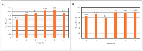 The uniaxial compressive strength (UCS) values are presented in Figure 9. The test results are shown after 7 days (left side of Figure 10) and after 28 days (right side of Figure 10). The x-axis displays the phosphogypsum content, while the y-axis indicates the strength values in N/mm2. It was observed that the UCS values increase with the addition of more binder. This improvement is attributed to the accelerated reaction resulting in the formation of expanding ettringite crystals from the Ca2⁺ and SO42⁻ ions in phosphogypsum. As these ettringite crystals filled the sample pores and interconnected through their needle-like structure, the overall compactness of the material increased, leading to enhanced strength. Based on these findings, it is crucial to continue increasing the binder content and monitoring the UCS values to fully understand its impact on the material’s strength [53].