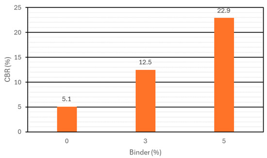 The test results for these prepared samples are displayed in Figure 10. As shown in Figure 10, increasing the amount of binder correlates with a rise in the California Bearing Index values. The mixtures of phosphogypsum and sediment demonstrated promising results, with a CBR value of 12.5% for the 3% phosphogypsum mixture and 22.9% for the 5% phosphogypsum mixture. In contrast, clean sediment alone exhibited a CBR value of 5.1%. According to the technical specifications set forth by the Roads of Serbia, the minimum CBR value required for the construction of road embankments is 5%. Based on this criterion, all three mixtures can be utilized in road embankment construction. Moreover, while some local studies report lower CBR values (typically ranging from 4% to 8%) for phosphogypsum-stabilized soils with higher binder contents (10–30%), the values obtained in this study suggest that even at relatively low binder contents (3% and 5%), phosphogypsum can significantly enhance the material’s performance, making it a promising option for soil stabilization in road construction [55].