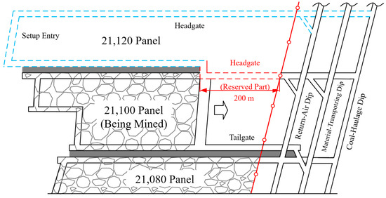 The 21,100 panel is located in the northwest of the No.2 horizontal mining area. Figure 1 shows the position of the panel. The main coal seam mined at a depth of 2656.8 ft (810 m) is 6.89 ft (2.1 m) thick on average, and dipped 2–17°, with an average dip of 6°. The coal seam roof was hard limestone with an average thickness of 16.4 ft (5 m) and f = 7, with no soft direct roof that will collapse with mining. As shown in Figure 2, the two roadways of the 21,100 panel were right-angled trapezoids with a net cross-section of 5000 × 2600 mm, originally designed with “bolt-net-beam” support. The floor of the excavated roadway has deformed in some areas. At the same time, problems such as roof deformation and rib-related problems have occurred. To enhance the coal recovery rate and reduce the appearance of ground pressure on the panel, the top-cutting and gob-side roadway retention technology was used to retain the headgate, since the 21,100 panel was 200 m away from the mining stop line.