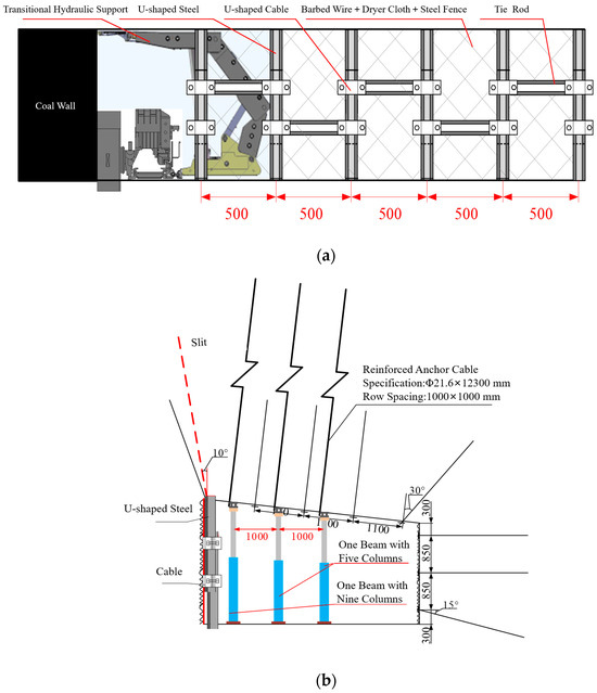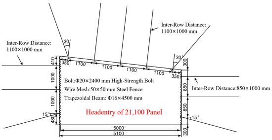 (2) Highly prestressed long anchor cables were used to support and reinforce the roof on the top side of the roadway. Anchor cables were used to optimize the stress state of the roof, thereby significantly improving its strength. They also can improve the integrity of the supporting structure and the supported rock stratum, so that the support load can be stably and continuously applied to the roof. The reinforced support should follow the roof pre-crack and slit process, and should be at least 30 m ahead of the working surface.