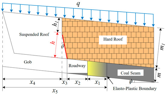 where σtw was the tensile stress of the uncut roof; Mtw was the bending moment of the uncut roof; Wtw was the bending section coefficient of the uncut roof; q was the overburden load borne by the hard roof; X4 was the distance between the uncut roof and the end of the cantilever beam; and ρ was the density of the hard roof. X4, X5, h1 can be given as [13]:
