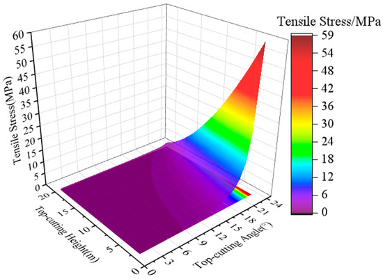The relationship between the tensile stress of the uncut roof and the top-cutting height and angle is shown in Figure 4, when the coal seam dip angle is set to 6° and roof thickness is set to 5.0 m.