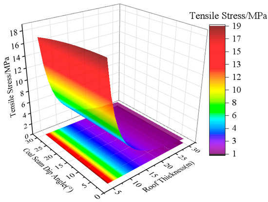 Figure 5 shows that when the top-cutting angle is 10°, the tensile stress of the uncut roof was inversely proportional to both the coal seam dip angle and the roof thickness. Moreover, the sensitivity of the tensile stress to the roof thickness was greater than that to the coal seam dip angle.