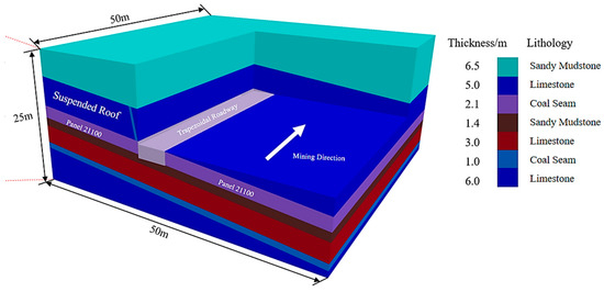 To study the deformation characteristics of the surrounding rock in the top-cutting roadway and to reveal the mechanism of surrounding rock control, based on the condition of the roadway in the 21,100 panel, a numerical calculation model for a trapezoidal top-cutting roadway has been established using FLAC3D Ver. 9.1 (ITASCA, Minneapolis, MN, USA). The model was 50 × 50 × 25 m in size, as shown in Figure 6.