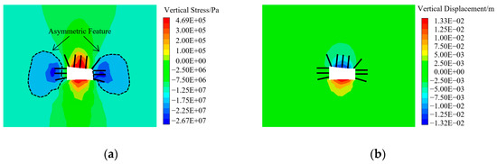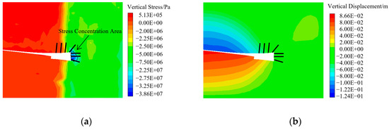 Stress distribution and deformation characteristics of surrounding rock during excavation period: (a) vertical stress; (b) vertical displacement.