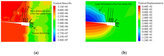 Stress distribution and deformation characteristics of surrounding rock under the condition of top-cutting: (a) vertical stress; (b) vertical displacement.