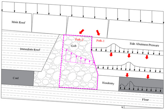 When performing top-cutting and roadway retention in an irregular trapezoidal roadway, the particularity of the surrounding rock control was mainly reflected in the uneven stress distribution, unbalanced cantilever beam effect of the roof, significant differences in surrounding rock deformation and complex stress transfer. The special structure of a trapezoidal roadway can lead to asymmetric stress distribution in the surrounding rock, especially with significant stress distribution differences in the roof and side, which were prone to forming stress concentration areas and thus affecting the stability of the surrounding rock. In this situation, top-cutting can disrupt the continuity of the hard roof to change the stress transfer path of the roof (Figure 10), alleviating stress concentration in the roof and side of the retained roadway, and reducing the pressure of the roof on the roadway. The specific control mechanism is as follows: