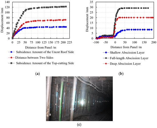 As shown in Figure 12a, during the process of top-cutting, the overall deformation of the roadway surface was slight. Within the range of 50 m when the panel was pushed, the sinking of the roof and the distance between the two sides increased sharply. As the panel continued to advance, the roadway surface deformation increased slowly, but the increase rate was greatly reduced; when the panel had advanced by 100 m, the roadway surface deformation basically reached the peak value and remained unchanged. The maximum roof subsidence was located on the roof of the top side, which was 120 mm; The maximum subsidence of the roof of the non-top side was only 44 mm, which was 36.7% of that on the top side. The maximum distance of the two sides in the roadway was 71 mm. It can be seen from Figure 12b that when the panel was 100 m away from the monitoring point, the roof began to produce delamination, but the amount of delamination was slight; the maximum total length delamination was only 3 mm. When the panel advanced to the monitoring point, the roof delamination increased sharply, until the panel was pushed 25 m past the monitoring point, when the amount of roof separation basically reached its peak. Among other things, the maximum separation layers in the shallow part, deep part and full length are 9 mm, 20 mm and 29 mm, respectively. Based on the actual situation on site (Figure 12c), the roof and sides of the roadway were flat and intact, and the effect of top-cutting was efficient, fully meeting the needs of on-site production. This showed that the previously-determined top-cutting parameters and the surrounding rock stability control technology were reasonable and feasible.