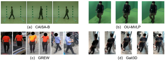 Gait recognition in practical applications faces challenges from various complex and dynamic factors. To address these challenges, it is crucial to understand the impact of different influencing factors and develop datasets that reflect real-world scenarios. In early investigations, researchers identified several factors that potentially influence gait recognition accuracy and intentionally collected gait data encompassing various influencing factors to conduct comprehensive studies. These factors include, but are not limited to, viewpoint variations, subjects’ attire, and carried items. The development and analysis of diverse datasets play a vital role in advancing gait recognition technology and bridging the gap between laboratory conditions and real-world applications. Several datasets have been created to study these influencing factors. For instance, the CASIA-B [1] dataset incorporates gait sequences under three different walking conditions (normal, wearing a coat, and carrying a bag) from multiple viewpoints. However, early datasets such as CASIA-B and OU-MVLP [2] were collected in indoor laboratory environments, as shown in Figure 1a,b. These idealized scenarios fail to fully reflect the complexities encountered in real-world applications. Consequently, methods based on such indoor, idealized data often exhibit suboptimal performance when applied to outdoor, real-world scenarios [3].