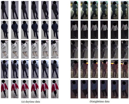 Examples of GaitDN dataset (with key information obscured). (a) Daytime data. (b) Nighttime data.