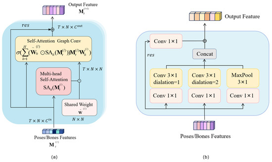 For each individual skeleton frame, our objective is to effectively capture the intrinsic relationships between different joints. Considering the advantages of self-attention mechanisms in capturing global information, we adopt a Self-Attention-based Graph Convolutional module (SA-GC) [31] to process 2D skeleton features, as illustrated in Figure 4a.