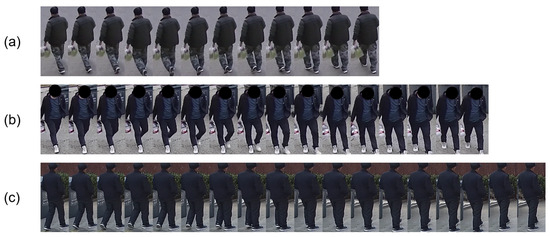 Examples of pedestrians with varying walking speeds in GaitDN. (a–c) illustrate the process of a pedestrian taking a step, from the moment the left foot leaves the ground to the moment the right foot leaves the ground in the subsequent step. (a) The pedestrian takes one step in 12 frames. (b) The pedestrian takes one step in 16 frames. (c) The pedestrian takes one step in 18 frames.