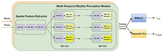 To capture the multifaceted features of human gait, our network integrates both 2D pose and bone data. This dual-input approach ensures a comprehensive representation of gait characteristics. The backbone network consists of two parallel streams, each dedicated to processing one of the two input types, allowing for specialized feature extraction from distinct gait representations. In each stream, we employ a series of SA-GC blocks to model the intrinsic relationships between joints and bones within individual frames of a gait sequence, effectively learning spatial features. However, the intrinsic connections within single skeleton frames cannot reflect the periodic patterns of gait. It is essential to capture the temporal dynamics of gait patterns. Consequently, we employ the proposed multi-scale temporal rhythm perception module to learn gait features at different time strides, enriching the temporal dimension of gait features. Finally, we perform pooling operations on the features learned at different time strides to obtain a robust and comprehensive final embedding that encapsulates both spatial and temporal gait characteristics. The network architecture of GaitSAT is illustrated in Figure 6. Suppose the output of the multi-scale temporal rhythm perception module is denoted as , where represents the number of output channels, T represents the number of frames in the sequence, and N represents the number of key points. The spatial feature mapping can be represented as