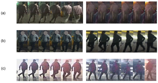 To ensure that the collected data closely reflect real-world application scenarios, we intentionally did not control any variables other than clearly distinguishing between daytime and nighttime data, as we aimed to gather data that are sufficiently complex to encompass a wide range of variations. Consequently, GaitDN not only incorporates lighting variations but also includes multiple potential factors that may impact recognition accuracy, comprising cluttered backgrounds, environmental occlusions of pedestrians, individuals carrying bags, and pedestrians wearing heavy coats, as illustrated in Figure 2. Some extreme cases of pedestrian gait sequences are shown in Figure 7. For pedestrian a, the two gait sequences exhibit significant variations in lighting direction and color, with clothing colors blending closely with the background, which poses a challenge for feature extraction algorithms. For pedestrian b, the sequences show not only changes in lighting color and intensity but also significant differences in clarity and camera angles. For pedestrian c, the background includes intense lighting variations and moving vehicles, leading to dynamic background changes. These examples highlight the complexity of the data in GaitDN, effectively simulating the challenging scenarios of real-world nighttime environments. To protect privacy, the faces of subjects in the samples were pixelated. The diversity of influencing factors enables GaitDN to better simulate various complex situations that may be encountered in practical applications, providing researchers with a more comprehensive and authentic testing platform. This not only aids in enhancing model performance in complex environments but also provides a crucial data foundation for developing more robust and adaptive gait recognition algorithms.