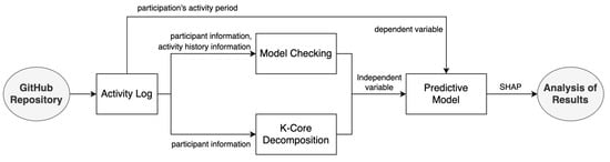Figure 1 outlines the study’s methodology, starting with data collection from GitHub repositories. Activity logs are analyzed using Model Checking to examine behavioral patterns and K-Core Decomposition to assess network centrality. These analyses generate variables for the Predictive Model, which estimates participant activity duration. Finally, SHAP analysis interprets the results, highlighting key factors influencing long-term engagement.
