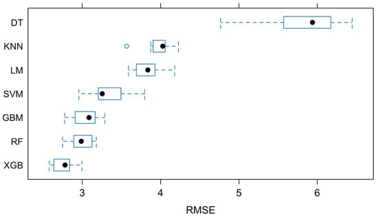 As shown in Figure 3, the XGBoost (XGB) model achieves the lowest RMSE compared to the other models, which signifies that it has the highest predictive performance. Other models such as Random Forest (RF), Gradient Boosting Machine (GBM), Support Vector Machine (SVM), Linear Regression (LM), K-Nearest Neighbors (KNN), and Decision Tree (DT) were also evaluated. However, due to XGBoost’s superior performance, it was selected for further analysis in this study.