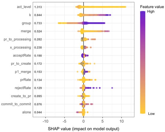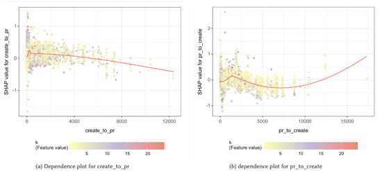 This section analyzes the time intervals between key actions related to PRs: the time from branch creation to PR submission (create_to_pr) and the time from PR submission to the creation of a new branch (pr_to_create). These intervals provide insights into how efficiently participants work within the project and how quickly they engage in subsequent activities, which could impact their long-term participation. Figure 10 shows the SHAP values results of the independent variables related to the relationship between branch creation and PR.