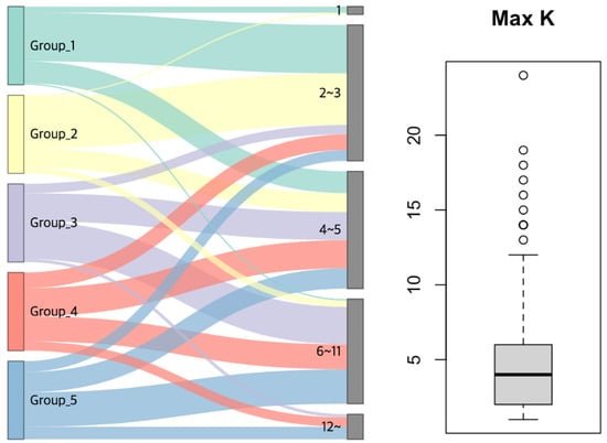 Figure 5 shows the distribution of maximum k values for participants in each group of GitHub projects. The k-value ranges in the Sankey diagram were determined based on the distribution shown in the boxplot. As a result, projects in Group 1 tend to have lower k values, with most of these projects having weak connections among participants. In contrast, projects in Group 5 tend to exhibit higher k values, indicating that projects maintained over a longer period have more complex participant networks. This suggests that for a project to be successful in the long term, core participants must actively participate and occupy central roles within the network. Thus, as k values increase, participants tend to collaborate more closely within the project, playing a significant role in its long-term success and maintenance. The fact that long-term projects in Group 5 have higher k values underscores the importance of core participants with high network centrality in ensuring the sustainability of the project.