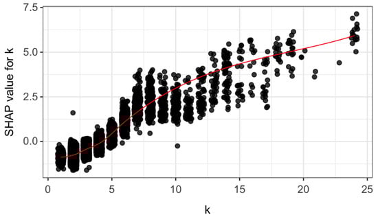 To better interpret the results of the XGBoost model, we utilized SHAP (Shapley Additive Explanations) values. SHAP is one of the methodologies used to interpret machine learning model predictions, providing a quantitative understanding of how each feature (independent variable) contributes to the model’s prediction [33,34]. SHAP values are based on the Shapley values from cooperative game theory and calculate the contribution of each feature for every data point. By doing so, SHAP enhances the interpretability of complex “black-box” models like XGBoost. A key advantage of SHAP is that it guarantees the fair distribution of contribution among the features. The higher the SHAP value for a particular feature, the more significant its impact on the prediction. Additionally, SHAP values can be either positive or negative: a positive SHAP value indicates that the feature contributes to increasing the predicted value, while a negative SHAP value suggests that the feature decreases the predicted value.