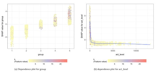 Figure 7b visualizes the relationship between activity level (act_level) and SHAP values. In this context, a lower act_level corresponds to more frequent activity. The plot shows that as act_level decreases, SHAP values increase significantly, implying that contributors with higher activity frequencies are more likely to participate for longer periods. Notably, when act_level approaches zero, SHAP values rise sharply in the positive direction, indicating the presence of highly active contributors who often occupy central positions within the collaboration network. Conversely, as act_level moves away from zero, SHAP values trend negatively, suggesting that less frequent contributors are more likely to have shorter participation durations. These contributors are often located on the periphery of the network, indicating weaker integration into the collaborative framework.