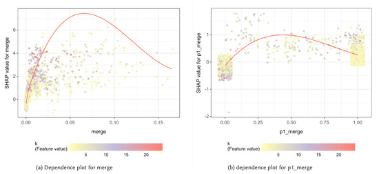 Figure 8a shows the SHAP dependence plot for the merge variable, representing the participant’s experience with PR merges. The graph clearly indicates that when participants have no merge experience (values close to 0), the impact on their participation duration is negative. This suggests that participants who never get their PRs merged are likely to reduce or stop their contributions over time. However, the moment participants gain merge experience, there is a sharp increase in the SHAP value, indicating a significant positive influence on their engagement. participants with merged PRs tend to stay active for longer periods, which underscores the importance of successfully merging their contributions. Moreover, participants with higher k values—those more central to the project’s network—are often among those who have had their PRs merged. This highlights the correlation between merge experiences and a participant’s increasing role in the project’s network structure, reinforcing their engagement and participation.