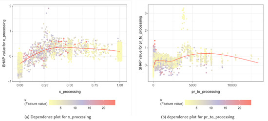 Figure 9a illustrates the impact of the probability of immediate PR processing (x_processing) on participant activity duration. The analysis reveals that when the probability of immediate processing is close to 0, SHAP values are negative, indicating a detrimental effect on activity duration. Conversely, as the probability approaches 1, SHAP values shift positively, suggesting that prompt responses to PRs can enhance participant engagement. This highlights the importance of timely feedback in fostering sustained participation, particularly for participants located on the periphery of the network. Peripheral participants appear to be more significantly influenced by immediate PR processing, indicating that prompt handling of their PRs can encourage long-term activity. On the other hand, participants with high k-values—those in the network’s core—are predominantly distributed around a 25% probability of immediate processing. This distribution suggests that these central participants are less affected by immediate processing, possibly due to their established roles and deeper integration within the project.